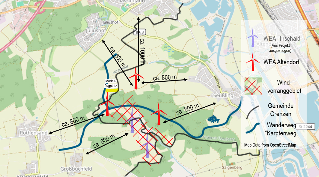 Wir lehnen die Pläne für die Windräder ab mit je über 260 Metern Höhe zwischen Seußling, Sassanfahrt, Juliushof und Rothensand. In Planung sind auf Seite der Gemeinde Altendorf 3 Windräder und (bis zum 1.9.2025) 2 auf Seite der Gemeinde Hirschaid, Gemarkung Rothensand/Großbuchfeld. Hirschaid ist mittlerweile aus dem Projekt ausgestiegen.